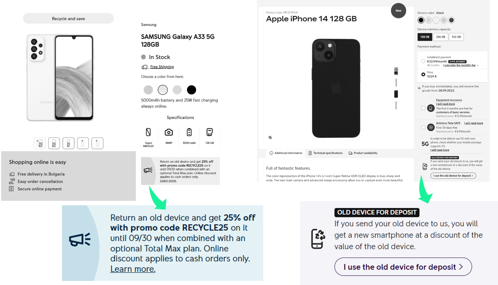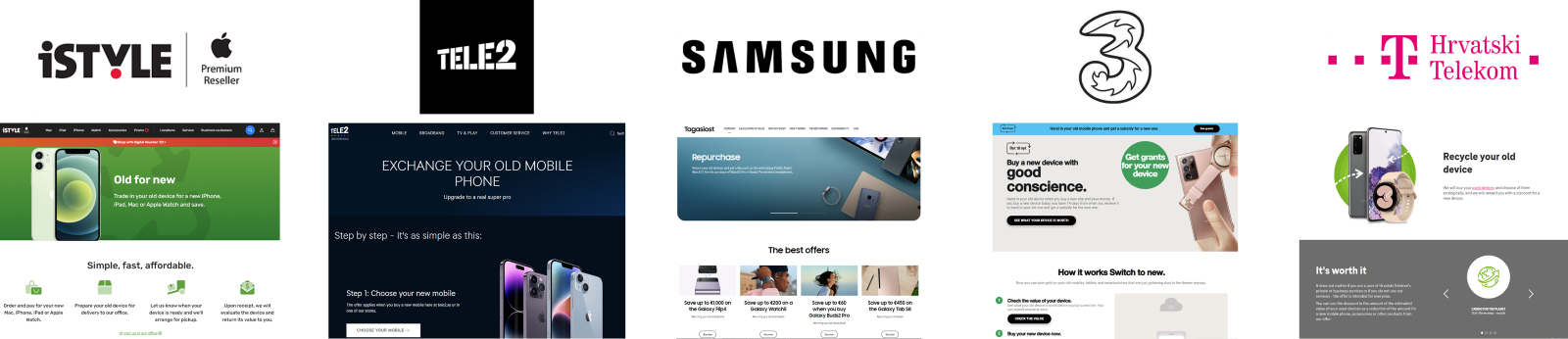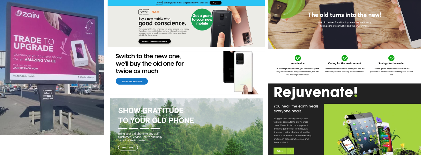 Create a custom landing page that clearly explains the trade-in process, provides an overview of the device journey, and details the environmental impact. This landing page should also outline the next steps for customers, ensuring they understand how to proceed. Additionally, the trade-in option can be promoted through multiple channels such as homepage banners, physical banners in stores, and video ads. These channels help increase visibility and attach rate, while the landing page builds trust and provides detailed information. Example campaign headlines used by other partners include "Get something for nothing" and "Old for new". Click on the image for a bigger version: